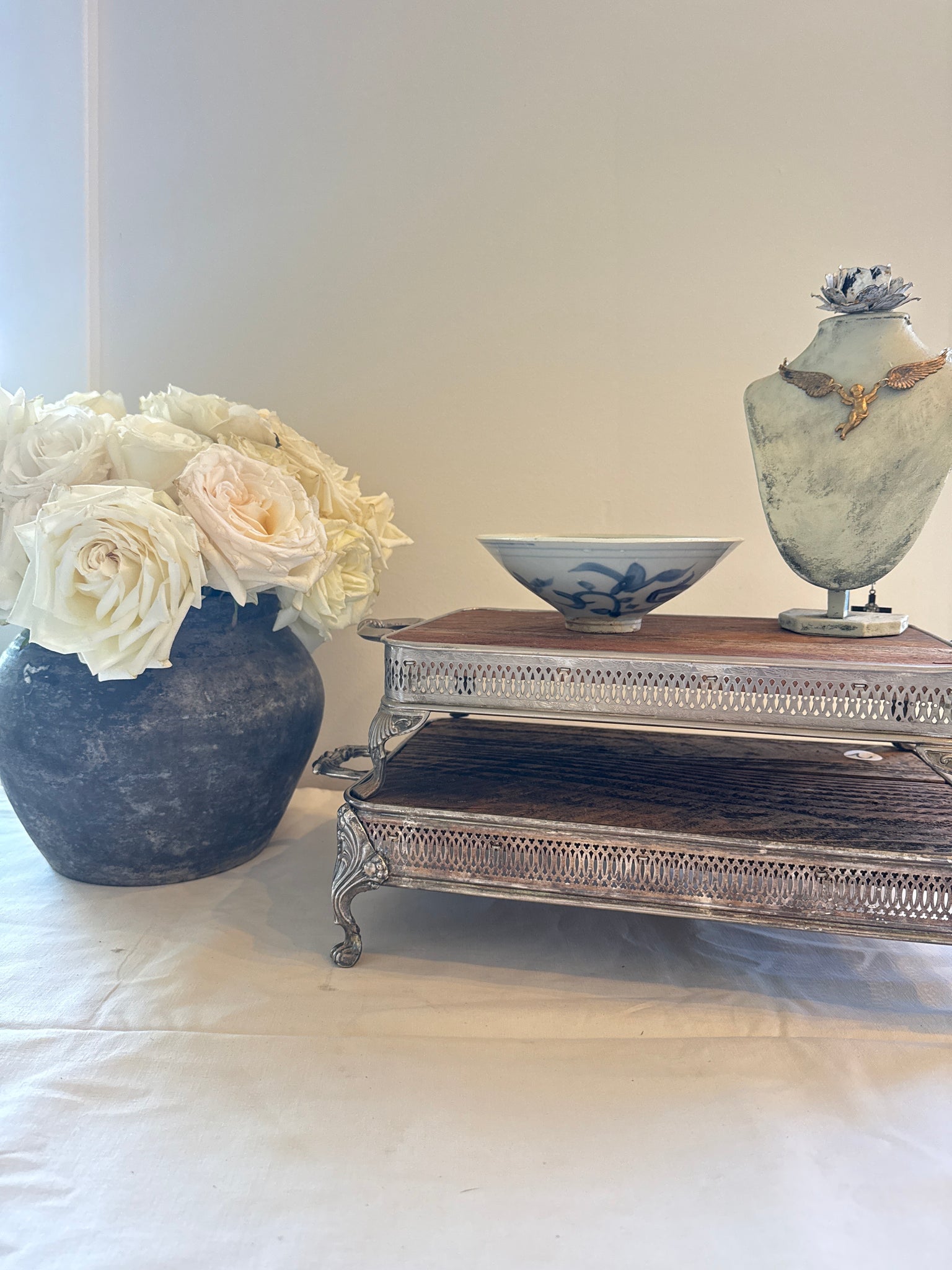 I have given this old silver serving piece new life and made it into a beautiful display piece, using old barn wood and time treasured silver trays.